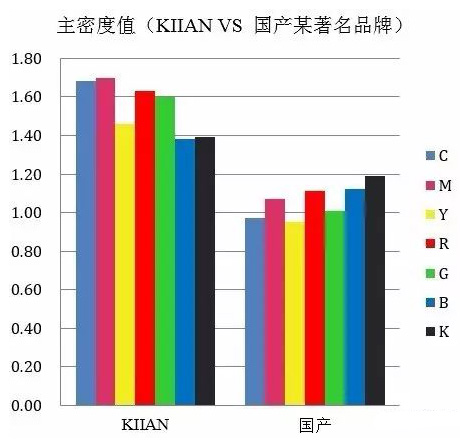 下圖為色密度值對比,實驗在國內某著名的轉印紙廠家完成,除了墨水不同,其他所有條件均相同: